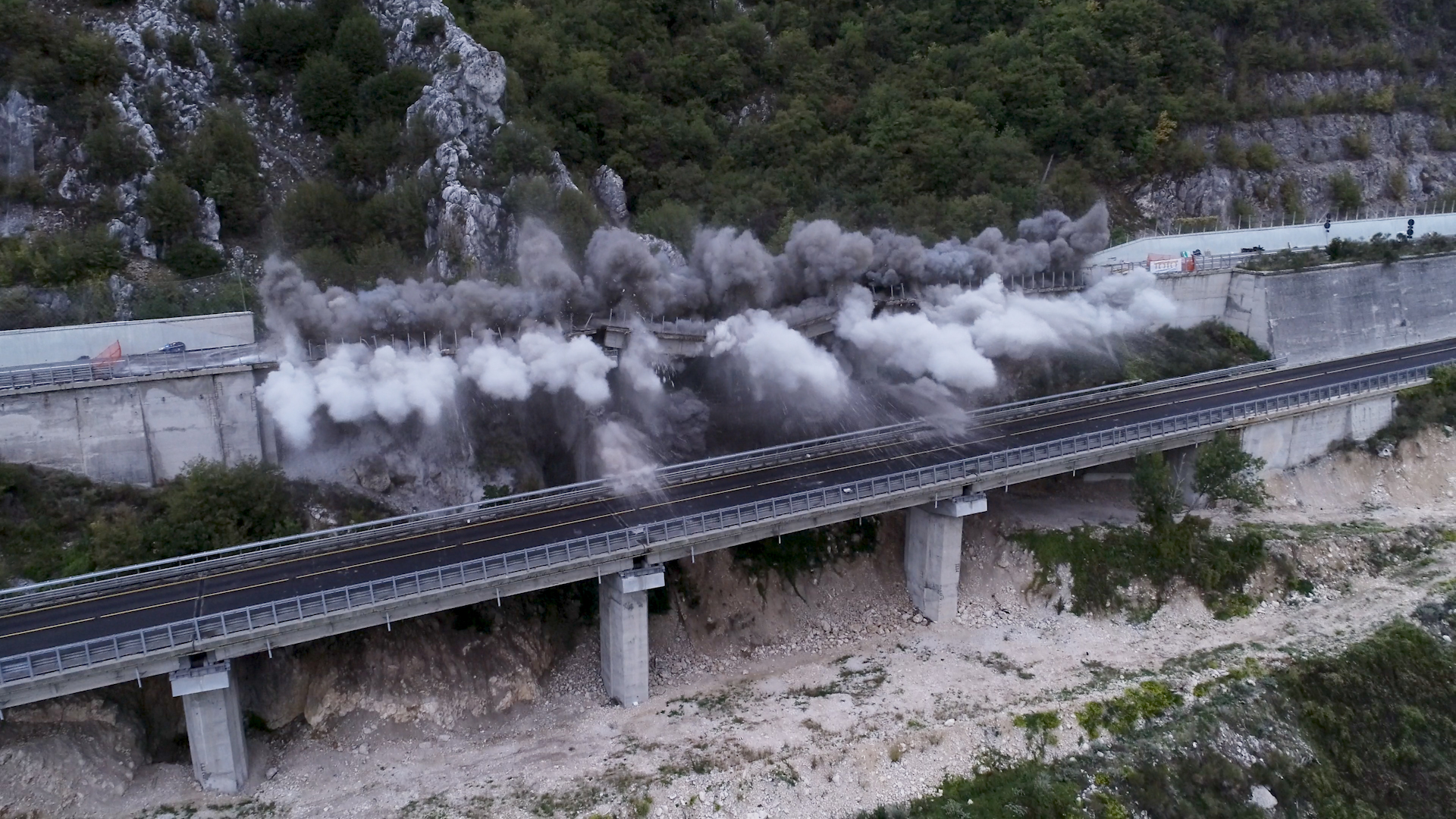 Abbiamo concluso la serie di abbattimenti controllati in programma sulla tratta L’Aquila – Tornimparte prima dello stop temporaneo imposto dall’inizio della stagione invernale. All’alba di domenica 17 ottobre le microcariche esplosive hanno fatto brillare la carreggiata est, in direzione Teramo, del viadotto Le Pastena, sul fianco scosceso di un pendio, ad oltre 1000 metri di quota, di fronte a Villagrande di Tornimparte. Il transito dei veicoli è stato, come di consueto, interrotto nelle due carreggiate dell’autostrada A24, per consentire l’abbattimento, e riattivato già alle 8.30 di questa mattina, prima di quanto previsto, dopo solo due ore e mezza di chiusura, sulla carreggiata opposta a quella demolita.