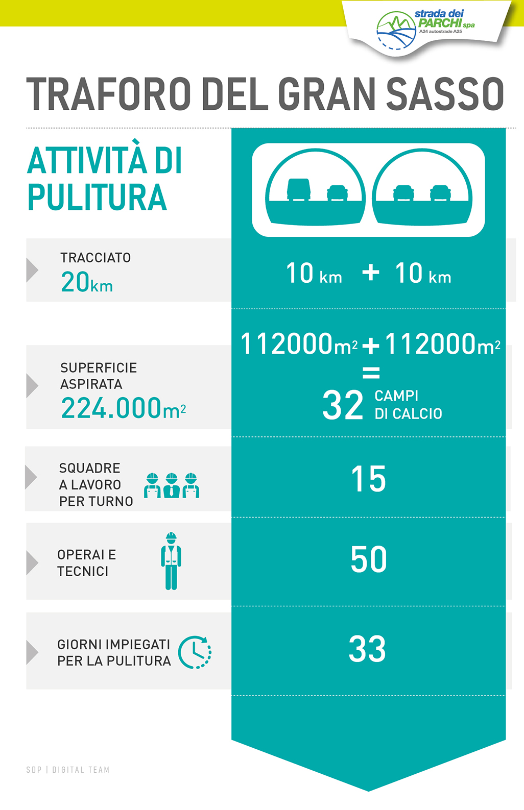 Concluse le attività di pulitura del Traforo del Gran Sasso. Questa mattina alle sei, le squadre di lavoro hanno ultimato la pulitura con la tecnica dell’aspirazione su tutta la superficie di 20 km di gallerie. I lavori si sono chiusi con quasi una settimana di anticipo rispetto alle previsioni. Le attività di pulitura delle calotte sono state avviate nella notte tra il 14 e 15 ottobre, alla presenza di Giancarlo Cancelleri, viceministro delle infrastrutture e dei trasporti. Secondo le previsioni, i lavori si sarebbero dovuti concludere lunedì prossimo, per via dell’enorme mole delle strutture interessate, ogni galleria è infatti lunga circa dieci chilometri.